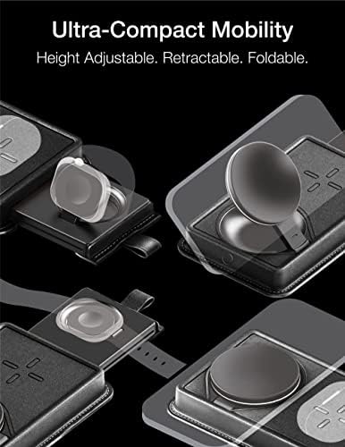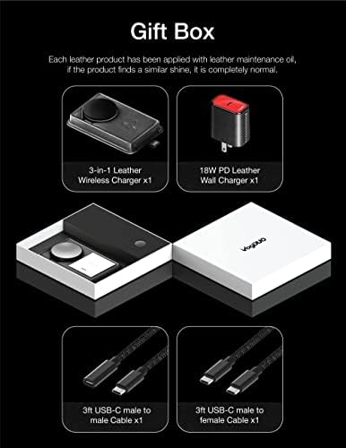 VogDUO 3 in 1 Wireless Magnetic Charger – Foldable Retractable 15W Charging Stand with Genuine Leather 6ft USB C Cables Nightlight for iPhone, MagSafe Cases, AirPods Pro, Apple Watch (Black)